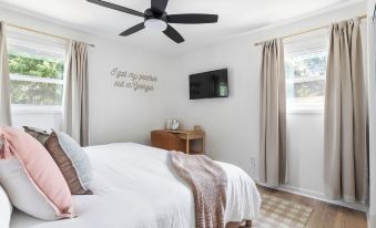 Going upstairs you will find 3 bedrooms and 2 bathrooms. The master suite features a king bed, eye catching plaid wallpaper, and on-suite bathroom. Next to the master is the other king bed nestled inside the perfectly themed Georgia peach room. The Georgia peach room has a small workspace… if you must work while on vacation. The last bedroom upstairs has a queen bed with a beautiful headboard, and luxury bedside lamp.