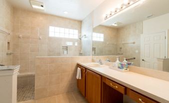 The primary suite offers a luxurious retreat with a plush king-size bed, a big screen TV, and a handicap accessible bathroom. This bathroom features grab rails and a roll-in shower for added convenience and comfort. The other two rooms provide comfortable sleeping arrangements with a king-size bed in one room and a queen-size bed in the other. A second bathroom ensures that everyone has their own space. Additionally, there is an interior laundry room for your convenience.