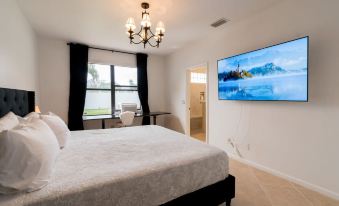 Experience comfort and convenience at our newer 3 bedroom, 2 bathroom house in Rockledge. Just a short drive from the USSSA Complex, 15 minutes to the beach, and with easy access to Orlando, this is the perfect base for your vacation. With a large open floor plan, plenty of seating, and modern amenities like a massive TV and electric fireplace, you'll feel right at home. Three dedicated work spaces and a spacious dining room table cater to both remote work and family meals. The well-stocked kitchen ensures all your cooking needs are met. Relax on the screened-in patio while the kids and dogs enjoy the expansive yard. The primary suite features a king-size bed, big screen TV, and a handicap accessible bathroom with grab rails and a roll-in shower. The remaining two rooms offer king and queen-size beds, along with a second bathroom. An interior laundry room adds convenience. Close to stores, restaurants, and a nearby park, our neighborhood has everything you need for a memorable stay.