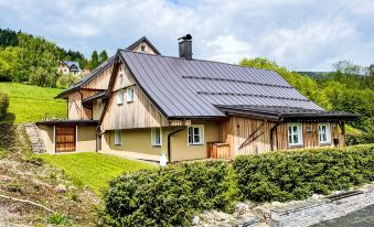 Very beautiful country house "Chalupa U Bobra", 2 storeys, detached. 2 apartments in the property. In a quiet, sunny position, 500 m from the edge of the forest, 1.3 km from the skiing area, 1.7 km from the river, 10 m from the stream. For shared use: property. Patio, barbecue, fireplace, children's playground (slide, swing). In the house: WiFi, sauna (extra). Playroom, table football, storage room for bicycles, storage room for skis, central heating system. Parking at the house. Grocery 500 m, supermarket 1 km, restaurant 800 m, bus stop "Rokytnice nad Jizerou, nám." 1 km, outdoor swimming pool 4 km, indoor swimming pool 20 km. Golf course (9 hole) 15 km, tennis 2 km, minigolf 8 km, walking paths from the house 10 m, cycle lane 300 m, ski lift 1.3 km, chair lift 1.3 km, slopes 1.3 km, ski rental 1.3 km, ski school 1.3 km, cross country ski track 1.3 km, children's playground 1 km. Nearby attractions: Huťský vodopád 5 km, Harrachov - sklárna, minipivovar, Mumlavský vodopád, bobová dráha 14 km, Příchovice, Kořenov, Jizerka 15 km, Jilemnice, Szklarska Poręba 20 km, Zoo, Aquapark Babylon Liberec 40 km. Well-known ski regions can easily be reached: Rokytnice nad Jizerou 3 km, Paseky na Jizerou 7 km, Harrachov, Vítkovice 13 km. Well-known lakes can easily be reached: Vodní nádrž Souš 20 km. Hiking paths: Okolo Rokytnice 500 m, Pašerácká stezka 2 km, Krakonošova cesta 5 km. Please note: suitable for families, suitable for seniors baby equipment on request (included). The sauna is accessible from the outside, it is for 8 guests. Sauna is available in the period 1.11.-30.4. (for free), in the period 1.5.-31.10. is on request (and for an extra charge). 4-room apartment on 1st floor. Very beautiful and luxurious furnishings: 3 rooms, each room with 4 beds, dining table, kitchen corner, shower/WC and TV. Large living room with TV. Large garden. Barbecue, sitting area. Beautiful view of the countryside. Facilities: children's high chair, baby cot. Internet (WiFi, free). Please note: non-smoking house. Maximum 1 pet/ dog allowed. Fire extinguisher. Beer tap available.