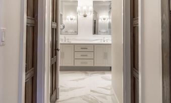 Gorgeous marble countertops with two vanities, two sinks, a make-up mirror and two hairdryers for ease to get ready in the mornings. Walk-in shower has luxurious spa-like rainfall shower heads and marble-tiled seating.