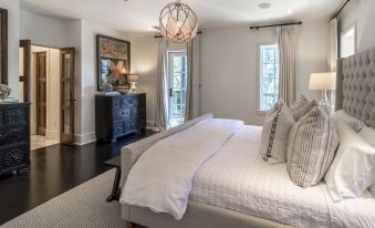 Spacious with two large, separate sitting areas with a flat-screen television and a gas-burning fireplace and natural light from windows overlooking the Rosemary Beach community. King-sized master bed with master closet, two bedside tables, and two chest of drawers for ample places to unpack and feel right at home. Convenient access from the master bedroom to the wrap-around porch with wicker seating and porch swing that overlook the coveted, homeowners green space of the home.