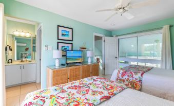 Primary Suite: Features a king bed, television, en suite bath with a walk-in shower, private balcony overlooking the bay, and a walk-in closet.