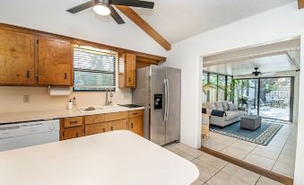 With three bedrooms, two bathrooms, two light-filled living rooms (each with their own Smart TV's), and a screened in pool, this property suits a variety of needs. While most of the homes original 80’s features still live on today (hello light pink bathroom tile!), it's furnished with brand new, comfortable mid-century flair, and designed for true vacation leisure.