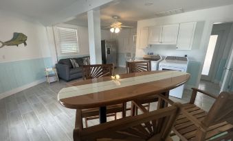 Downstairs is accessed by its own entry and includes full bathroom, surfboard pub table, refrigerator, pull out couch and washer/dryer.