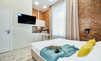 Our 3-star hotel offers stylish Loft-style rooms that combine elegance and convenience. The spacious rooms are equipped with a kitchenette with a full set of necessary accessories, which makes you feel at home. Each room has comfortable beds, modern bathrooms with showers and all necessary hygiene products, as well as free Wi-Fi — all this creates ideal conditions for your stay.
