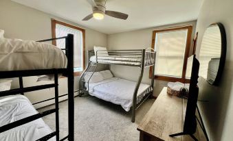 2 bedrooms: 1 bunk bed 1 single bed 1 queen bed and 1 double bed