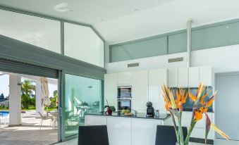 The architecture of this beautiful, modern villa allows the light overflow the inside seamlessly from the sunny outside. The villa has white marble floors and has the most beautiful views towards the Mediterranean Sea, the snowy mountains of Sierra Nevada and the picturesque village of Salobreña with the 13th century Moorish castle built on the top of a rock. This castle is lit up at night so your view will become even better. Villa Dorda faces the south, so you can enjoy the Spanish sun the entire day from sunrise until sunset. It also has a private heated pool and a spacious, partly covered terrace so you can relax in both the sun and shade. A bathroom is adjacent to the terrace. The villa has an elevator and it is completely wheelchair accessible.