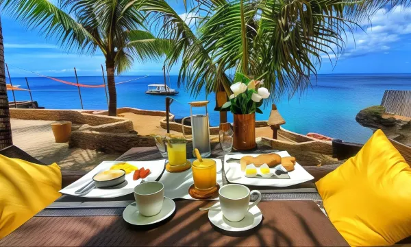 Location & Environment: The hotel is situated in an idyllic, secluded setting with direct access to a coral reef and sea turtles. The Balinese-inspired decor, lush garden, and panoramic ocean views create a tranquil, "paradise-like" atmosphere.