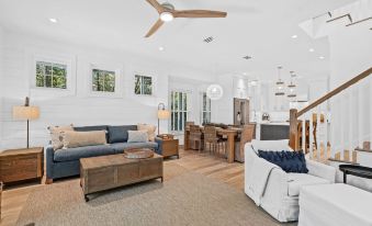 Once you arrive at 30A Blue, you will see that our home has been designed for your every convenience and comfort. Better than new, our home has been remodeled from top-to-bottom, inside and out. The first and second floor wrap around porches offer plenty of choices for outdoor entertainment and relaxation. Listen to the waves and catch cool ocean breezes from the second floor porch, while the 'kids at heart' enjoy the first floor side porch with a hanging chair and fun outdoor games. Step inside and prepare to be wowed with sunny and bright, open-concept living. From gathering for family meals or laughter-filled family game and movie nights, to creating gourmet meals, our indoor space provides room for everyone. The living room offers comfy seating options and a wonderful fireplace for the cooler winter months. A large farmhouse dinning table seats 6 and the breakfast bar has additional seating for 3. The gourmet kitchen has all the bells and whistles for the chefs in the group. The kitchen is fully stocked from the gas range, French-door refrigerator, microwave drawer and dishwasher to the blender, toaster, pancake griddle, waffle maker, and options for your morning brew include a drip coffee maker and Keurig machine. We have provided it all for you.