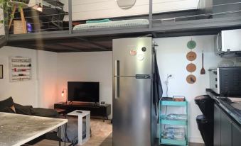 Apartment with mezzanine, sunken TV room. Hot and cold air conditioning. Full kitchen. Laundry room with washing and drying machine (shared), iron, ironing board, cleaning equipment.