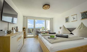 Our modern apartment (approx. 30 square meters) offers space for max. 2 persons. From the south-facing balcony you have a wonderful view of the alpine panorama. The apartment is equipped with a bedroom and living area with a large double bed, a dining area, a 50" Smart-TV, a fully equipped small kitchen and a bathroom with toilet / shower. You can expect a newly renovated apartment (05.2020) that invites you to relax and unwind. You also have free access to the indoor pool, sauna area, fitness room and much more.