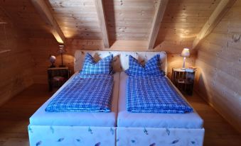 So you can feel right at home, we like to light the fireplace when you come. In the fully equipped kitchen you will find everything you need to be well looked after and on the huge sofa landscape you can laze after an active day. The large bedroom upstairs can accommodate 4 people (two beds each 1.80 m and 1.40 m wide). 2 additional persons can sleep in single beds in the adjoining room. Next door is the bathroom with a corner bath. (A shower is planned.) The toilet is on the ground floor. In the large garden and on two terraces you can sit outside in good weather. The wooden house was built in the year 2003 with a lot of love and craftsmanship predominantly from natural materials. Please feel at home!