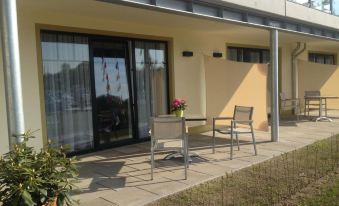 Wir hatten das Aparthotel als Ausgangspunkt unserer Fahrradtouren gewählt. Der Fahrradständer hinter dem Appartement ist nicht diebstahlsicher und nicht für E-Bikes geeignet. Aber die Fahrräder kann man über Nacht im Bootshaus abstellen. Das Appartment ist riesig groß und Wohnküche und Schlafzimmer getrennt. Die Zimmer sind ruhig. Vom Nachbar bekommt man nichts mit, nur auf der Terrasse. Küche: Geschirr für 4 Personen ausreichend. Das Angebot Frühstück im großen Saal des Gebäudes einzunehmen haben wir dankend angenommen. Wurst, Käse, Marmelade, Ei, Yoghurt,Obst - einfach,nix besonderes. Von der Terrasse hat man einen schönen Blick auf den Yachthafen. Schade dass man hier nicht baden kann. Die in den Hotelunterlagen nächst gelegene Badestelle "Großmuttersloch" liegt ca 1500m entfernt im Naturschutzgebiet und ist nur über einen Dschungelpfad zu erreichen.