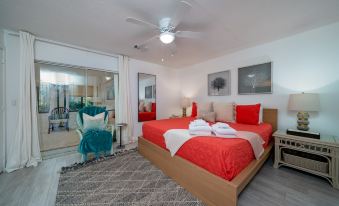 The master bedroom has a king bed and en suite bath. Sliding glass doors lead to the sun room. Enjoy watching your favorite shows on the 33" HDTV. The master bath has a single vanity with marble counter top and a tub/shower combination. Just down the hall is the guest bedroom with a queen bed and hall access bath.
