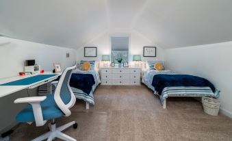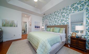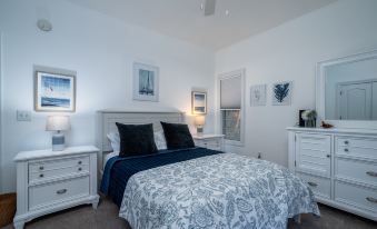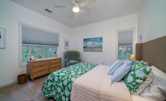 This spacious 3-bedroom, 2-bathroom home comfortably accommodates up to 8 guests. The primary bedroom features a luxurious king bed with an en suite bathroom and direct access to a screened porch, perfect for enjoying morning coffee or evening sunsets. The second bedroom offers a cozy queen bed with access to a full bath, while the third bedroom also boasts a queen bed and convenient hall bath access. Additionally, a finished room over the garage provides two twin beds and a desk, making it a great space for kids or extra guests.