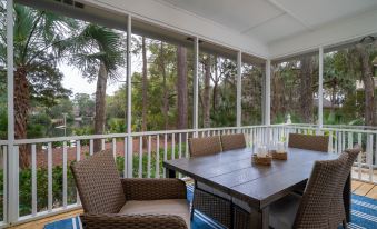 The large screened porch and soak in the stunning wooded and lagoon views. Start your morning with coffee on the wicker chairs or gather for a meal at the dining table the perfect spot to enjoy the natural beauty around you. Step outside to discover the outdoor amenities, including a deck area perfect for barbecues and a private yard for outdoor activities. Enjoy fishing right from the lake or take advantage of nearby recreational options such as tennis, biking, and kayaking.