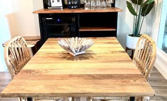 Inside the villa, a bright, airy, open floor plan features a dining area, stocked coffee bar with wine refrigerator, kitchen and living room area. The coastal kitchen features new quartz countertops, modern appliances, garbage disposal, ample serveware and cookware, and counter stool seating.
