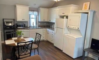 The kitchen is great for small meal preparation- it has a full fridge, a two-burner stove top, an electric skillet, a microwave, a toaster oven, and a dishwasher.