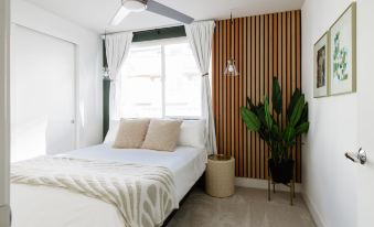 - The third floor is the primary (master) floor complete with primary bedroom, private balcony and large bathroom. Thoughtfully designed with a modern but organic feel, the primary bedroom gets lots of light, offers a TV with streaming capability, dresser with ample storage & side tables for cellphone/storage. In the warmer months, enjoy the ductless A/C mounted in the bedroom. All plants in the primary room are air-filtering plants to ensure the highest quality air for your stay.