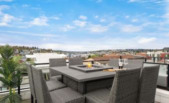 The best part of the house is the view! Whether you want to have a romantic dinner overlooking the city or front row seats to the Fourth of July or NYE's fireworks, the rooftop is not to be missed. We have furnished the rooftop to please all! Watch a game on the outdoor TV or enjoy sitting around the 8 person dining table with built-in fire pit. In the summer months, it is complete with a grill and bar cart. As the weather gets warmer, the rooftop planters will have seasonal herbs to cook with or to garnish your favorite cocktails (no pesticides have been used while maintaining the plants). Rooftop blankets (Nordstrom brand) are provided for the crisp fall nights.