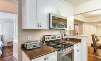 • Kitchen is equipped with stainless steel appliances and is fully stocked with cookware, silverware, servingware, spices, coffee & tea for all your cooking needs.