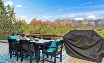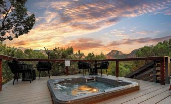 Experience panoramic views of the Sedona red rocks, enjoy private access to Oak Creek and unwind in the jacuzzi for ultimate relaxation on our 1 acre estate.