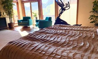 • Spacious Living Areas: The grand living room boasts a 20-foot stone fireplace, floor-to-ceiling windows, and sweeping red rock views.