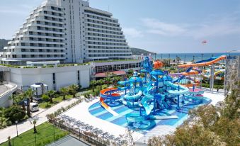 Great waterpark with different sections to suit all ages of children (and adults!). Three pools to choose from. There’s an adults only pool but there were young children in there on occasion so the no under 16 rule needs to be enforced. Massive main pool and a lovely activity pool where the animation team kept us entertained. The music plays all day and can be a bit too loud sometimes. The team work hard and brought a great deal of fun to the day with imaginative pool games. Nice beach area with plenty of sunbeds and shade. There were fantastic DJ sets on two nights (almost full-on raves!!) with food and drinks and a great band on another night, plus the usual entertainment for children and adults in the auditorium. Staff were fabulous throughout the hotel. Rooms clean with towel changes every day if required. The beach side lunch area was good but the food could sometimes be cold. The main restaurant had great choice. There are four speciality restaurants. The Italian was fabulous but the fish less so. The starters were delicious but the sea bass was dreadful. I’ve never had one presented to me like that - absolutely full of bones and poor tasting, dry, meat. The lobby bar was buzzing. Nice atmosphere for a pre and post dinner drink. There’s a patisserie that I didn’t try, but the cakes looked good. A really good all inclusive hotel and I’d go back!