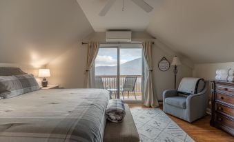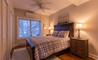The upper level holds two bedrooms, one with a king bed, a TV, and a private balcony. The other bedroom has a full sized bed and these rooms share a hallway bathroom. On the main level is a full kitchen and living room with a gas fireplace and HD TV. Enjoy dining with a view from the large window in the dining area. Situated on this floor is one queen bedroom and one full bath.