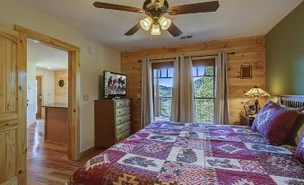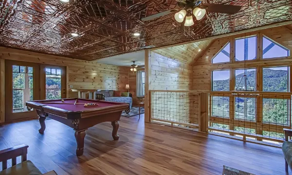 On up to the third floor to the Game Room where guests of all ages will enjoy a full-size pool table, video games and outdoor hot tub overlooking the gorgeous valley below. Also on the third floor, you will discover another queen suite with a private bath. Just off the Game Room, a bonus room has a day bed with a trundle which provides additional sleeping space to accommodate guests of all ages. If you are seeking a truly unique mountain experience, Sunset Lodge will provide those memories that will last a lifetime.