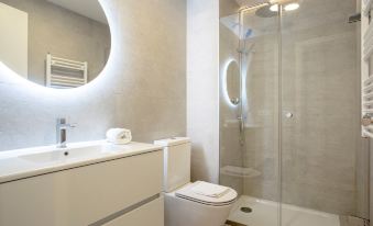 Upon entering the apartment we directly access a living-dining room with an open kitchen. Both rooms are very spacious and bright thanks to several windows. The living room has a sofa, a coffee table, two armchairs and a TV, as well as a pleasant corner with an armchair where you can read quietly, which gives access to a balcony that surrounds the entire room with a table and two chairs to enjoy a enjoyable evening. Next to this area there is a dining table with chairs with capacity for 6 people. The kitchen is integrated with the living room and it’s equipped with everything you need.