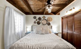 There are 3 bedrooms, and 1 loft (all with beds as shown in the photos -7 total) to accommodate a maximum of 13 guests. There are 2 ensuite full bathrooms and 1 common full bathroom. Downstairs there is a full bath off the kitchen - with tub/shower combo and full size washer dryer. The downstairs master has an enchanting rock shower with dual shower heads - rainwater and removable. Upstairs both bedrooms share a spacious Jack & Jill with a claw foot tub and dual shower head walk in shower.