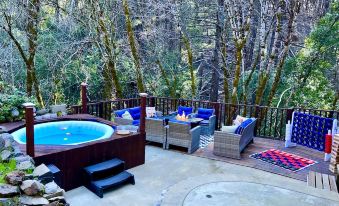 Surrounded by over 2 acres of trees you’re truly in Wonderland! With a large backyard deck overhanging the creek enjoy the sounds of nature while dining outside, bbqing, making pizzas, roasting marshmallows or soaking in the hot tub. Or relax in the spacious cabin, soak in tub, read in the library, play board games or stream your favorite shows. The possibilities are endless … you’ll never want to leave!