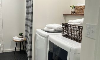 The spacious bathroom includes a large vanity, a beautiful, tiled shower, and an in-unit laundry area for added ease during your stay.