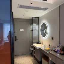 The hotel boasts a distinct style, with a cool, lounge-bar-like ambiance. Its location is excellent, providing easy access to all areas, including Shuibei Gold and Huaqiangbei. The room's smart features are impressive; the Xiao Du AI assistant controls the lights and air conditioning, which is super convenient for a relaxing stay. We also really liked that the TV supports screen mirroring. The hotel staff were incredibly friendly and thoughtful, even allowing us a late check-out.