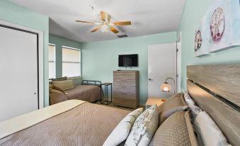 Follow the stairs from the living room up to the loft area along with two additional guest bedrooms which share a bathroom. The one guest bedroom is furnished with queen-size bedroom set and TV while the other is furnished with a double and a twin with twin trundle and TV.