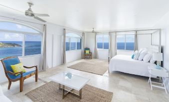 Above the main floor is an upper master suite also known as the "Presidential Suite". The spiral staircase leads you first to a gorgeous rotunda foyer. This is the entry way to the suite. The upper floor also features a walk out balcony and sun deck. There are 4 lounge chairs on the deck for your enjoyment. It is a perfect place to relax and take in the incredible views of St. Barths. The Presidential Suite features a king size bed, en-suite bathroom with walk-in shower, and walk-in closet. The suite also features a seating area with a convertible sofa that could serve as an additional sleeping space for a younger guest if needed.