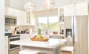 The modern kitchen is fully equipped and features an island/breakfast bar, a double door fridge with ice & water dispensers , an electric range with oven, an over the range microwave, Nespresso Machine, blender, toaster and American coffee maker.