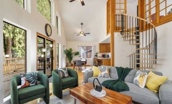 3rd floor (one bedroom with 3 beds) is only accessible via the spiral staircase.About pets:No pets allowed.About checkOut:Check out before 11:00 AM.About children:Children allowed: ages 0-17.There is a river and hot tub with no gates..About customRules:Any additional non reported guests will incur a $50 additional charge per day..Excessively high amount of trash will be fined..About checkIn:Check in after 4:30 PM.About smoking:Smoking is not permitted.About minBookingAge:Minimum age to rent: 20.About events:No events allowed.