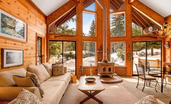 Perfect for families, this charming A-frame cabin is loaded with personality. Relax in the bright and sunny living area with comfortable furniture, soaring cathedral ceilings, lots of windows, and a warming wood stove. Prepare cost-saving meals in the full kitchen complete with a breakfast bar, and then dine together at the adjacent table. With a lower-level family room and a furnished loft, there's space here for everyone to spread out and relax. And with the addition of a full-size pool table, foosball table, Ping-Pong, and a dartboard, there are plenty of opportunities for fun.