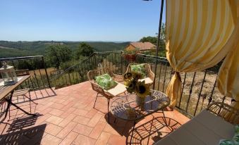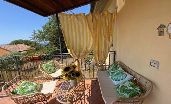 The upstairs cottage is accessed via a two-ramp staircase, at the end of which opens a delightful terrace covered by a wooden roof, equipped with wicker armchairs and a table for outdoor dining, with a wonderful view of the whole valley, which on clear days reaches the sea.