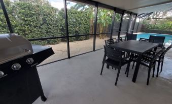-- Large, screened-in outdoor patio with propane grill adjacent to the pool