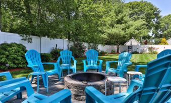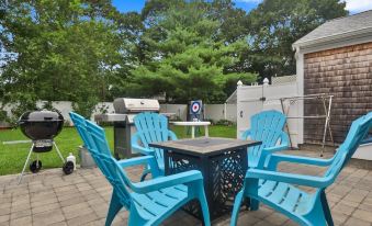 The fenced-in backyard offers a patio with plenty of space for Cape Cod summer gatherings, gas and charcoal grill, propane and wood burning firepits, plenty of seating and a new outdoor shower!