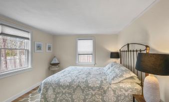 The dining area for four is perfect in the cozy kitchen with small gas stove and oven, microwave, and refrigerator (there is not a dishwasher). Plenty of counter space available to create meals and a coffee station is staged to help you get started in the mornings. If you need more space, the table can be folded down and provide dining space for two. A nearby window A/C keeps you cool but you can always open a window to allow the Cape breezes in.