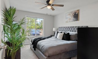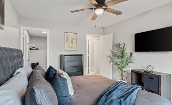 Indulge in a king-sized bed dressed in crisp, hotel-quality linens. Enjoy a mounted smart TV, white noise machine, full-body mirror, two nightstands, a dresser, and a spacious walk-in closet with ample hangers—all designed to help you unwind in comfort and style!