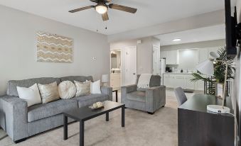 Step into a cozy yet modern living space, complete with a plush full-size sofa, armchair, and 43” smart TV. A dedicated desk setup and high-speed Wi-Fi make it easy to work or study remotely. Thoughtful touches like end tables, lighting, and contemporary decor create a warm, inviting environment.