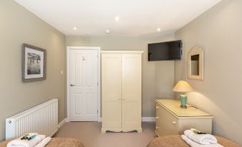 Attractive south facing twin bedded room with wardrobe, chest of drawers, bedside cabinet, wall lights, table lamp and wall mounted 32" tv.