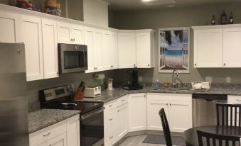 There is a large family room with 55" flat screen TV, sound bar and DVD player. A TV with XBox is also available (bring your own games). We also have one queen sofa sleeper. The kitchen is fully stocked with dishes, utensils, pans, Keurig, crock pot, waffle maker and juicer.