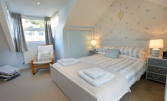 Bedroom 1 with king size bed. French doors lead out onto balcony with seating for 2 people with sea views looking towards Godrevy Lighthouse. Blankets available for the chillier evenings